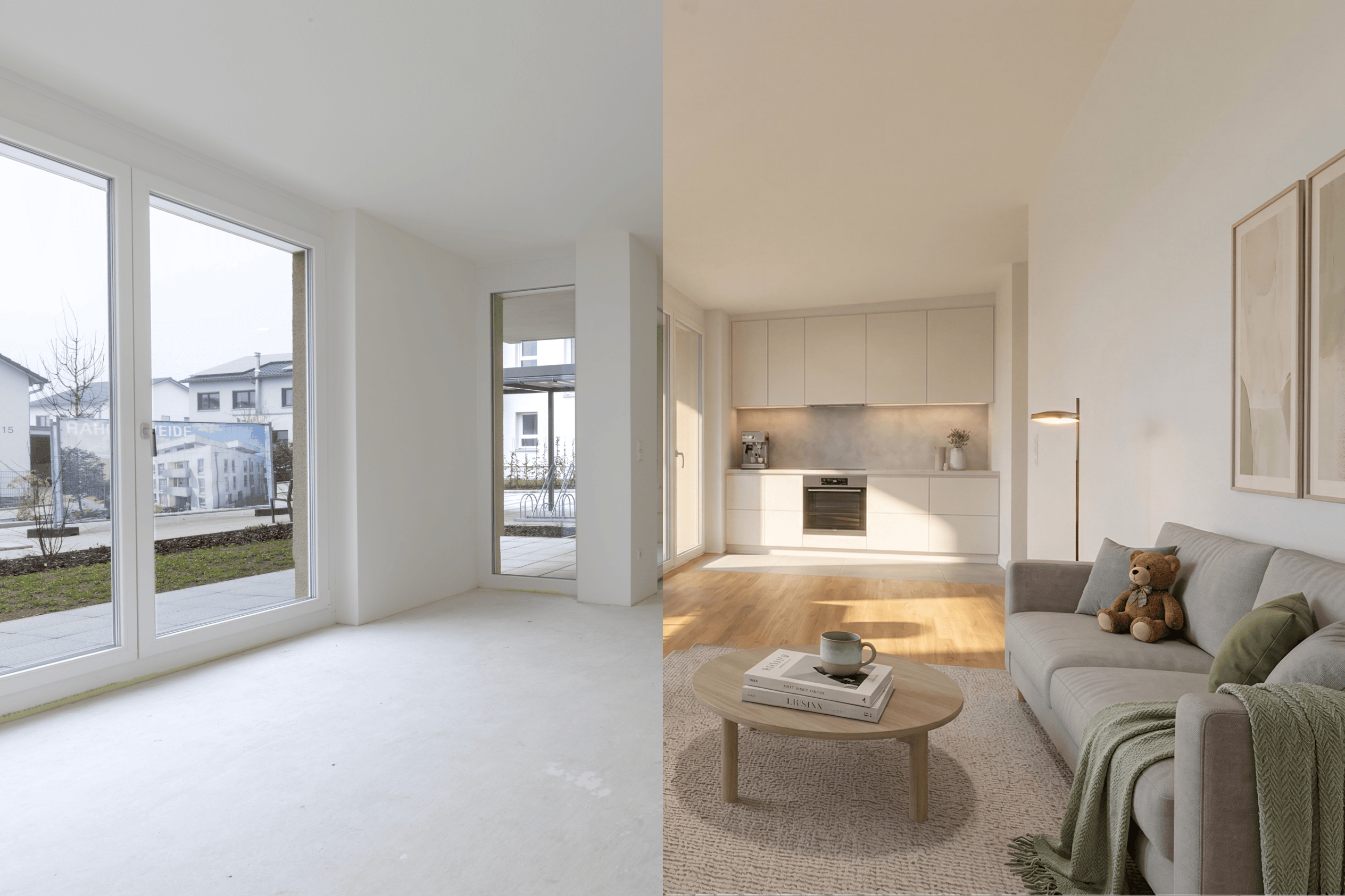 Im Rahmen eines Pilotprojekts haben wir gemeinsam mit dem Siedlungswerk digitales Staging als moderne Alternative zum klassischen Home Staging umgesetzt. Ziel war es, zukünftigen Familien früh zu zeigen, welches Potenzial in den Räumen steckt – emotional, realistisch und zeitgemäß.